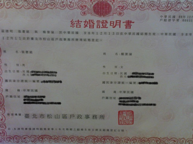 結婚對章。(因為隱私考量,部分文字霧化處理)