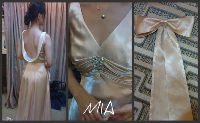 跟娃娃討論的結果,我們需要的是日本軟緞香檳金的緞面禮服。綜合這三張圖片的概念跟大綱,台灣的婚紗其實世界知名,價錢合理作工精緻,種類繁多,我想,沒有哪個國家的新娘會比台灣的新娘幸福了。 這三個圖給設計師看過之後,就可以開始打板製造了。 過兩天就可以去看樣布了,我想要跟設計師說,請幫我用同一塊布剪下來幫我做一個髮飾還是衣飾,我自己買。 這樣,我就可以自己收藏,屬於我的婚紗小秘密。